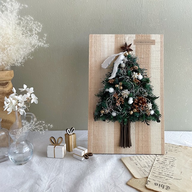 クリスマスの季節に、あなたの部屋を特別な空間に変えてみませんか?このプリザーブドフラワーとドライフラワーを用いたクリスマスツリーは、一点一点異なる木肌、木柄のボードにアレンジし、自然の温もりを感じるデザインが特徴です。スタンドタイプのボードなので、どこにでも簡単に飾ることができ、小さなスペースにも華やかさを添えます。 ◆ドライ・プリザーブドフラワーの取扱説明書を一緒にお付けしております。 ◆ラッピングに関して ※無料・・・作品に合わせて、セロファンとペーパー&リボンで丁寧に包装させていただきます。 ------------------------------------ ◆オリジナルメッセージカード(名刺サイズ・無料)に関して オプションにてご希望のカードを選んでください。 ------------------------------------ :HAPPY BIRTHDAY :Congratulations! :HAPPY WEDDING :Especially for you!(特別なあなたへ) :THANK YOU! :Merry Christmas ------------------------------------ 代筆の場合・・カードの種類はお任せとなります。メッセージ内容は、備考欄にご記入ください。無地のカードをお付けする事もできますのでお知らせください。 ------------------------------------ ◆使用花材 ドライフラワー プリザーブドフラワー ◆サイズ 縦28.5×横18㎝ ------------------------------------- ◆配送に関して 発送方法 → ゆうパック お届け日、お時間帯のご指定をして頂けますのでお知らせくださいませ。 午前中 / 12-14 / 14-16 / 16-18 / 18-20 / 19-21 / 希望なし ※基本的に土日祝の発送は致しておりませんので、期間に余裕をもってご注文を頂ければと思います。 ★プリザーブドフラワー&ドライフラワーはとってもデリケートです。 梱包は細心の注意をはらって丁寧にさせて頂いておりますが、配送中に素材の特質上、多少花材が落ちる場合もありますので、予めご了承くださいませ。 ------------------------------------- ◆他サイトでも販売しておりますので、売り切れの場合もあります。随時更新はさせて頂いておりますが、何卒ご了承くださいませ。 ◆PC環境により、実際のお色と見え方が異なるばあいもございます。ご理解くださいませ。 ◆ご購入に際しまして、気になる点などありましたらお気軽にお問合せくださいませ。どうぞよろしくお願いいたします。