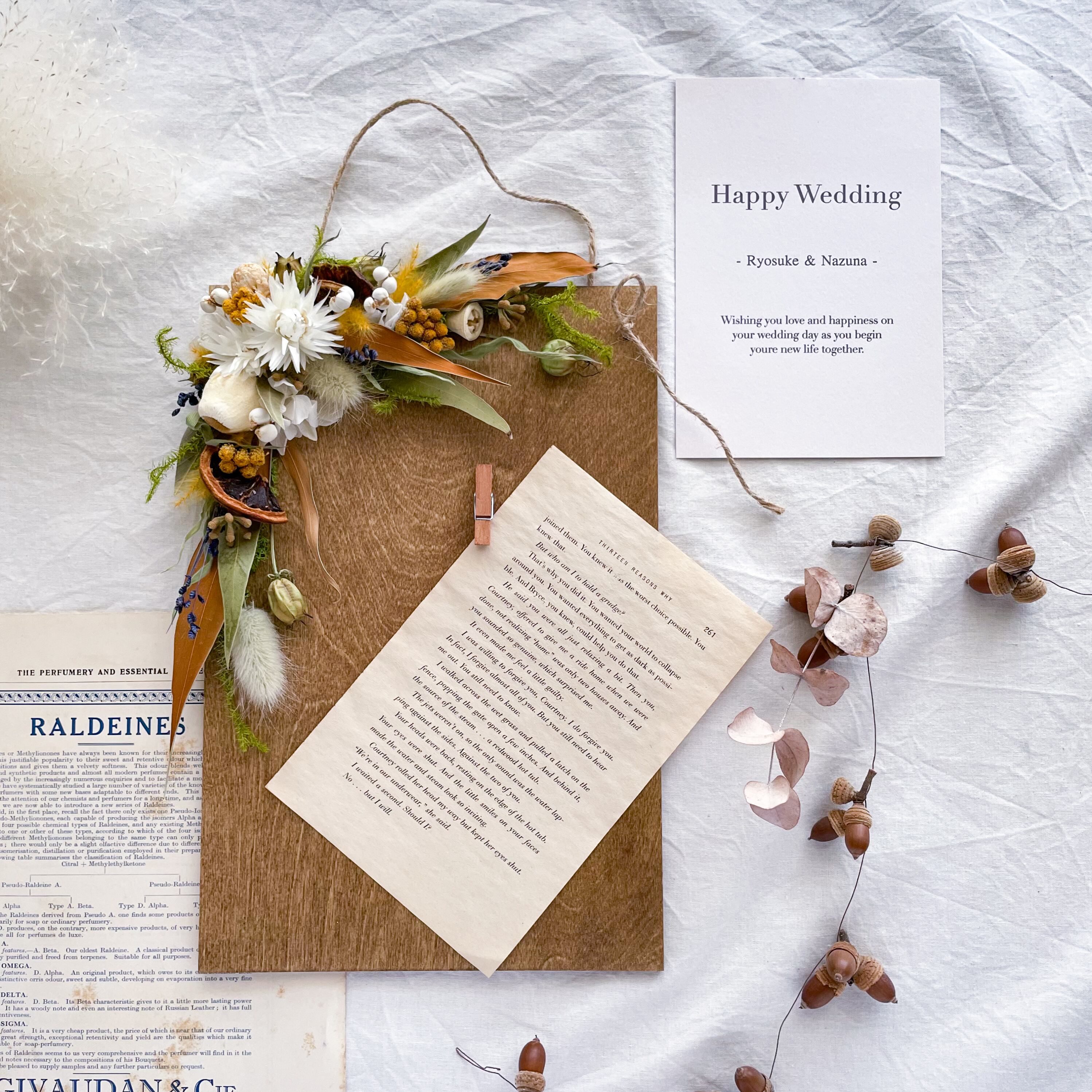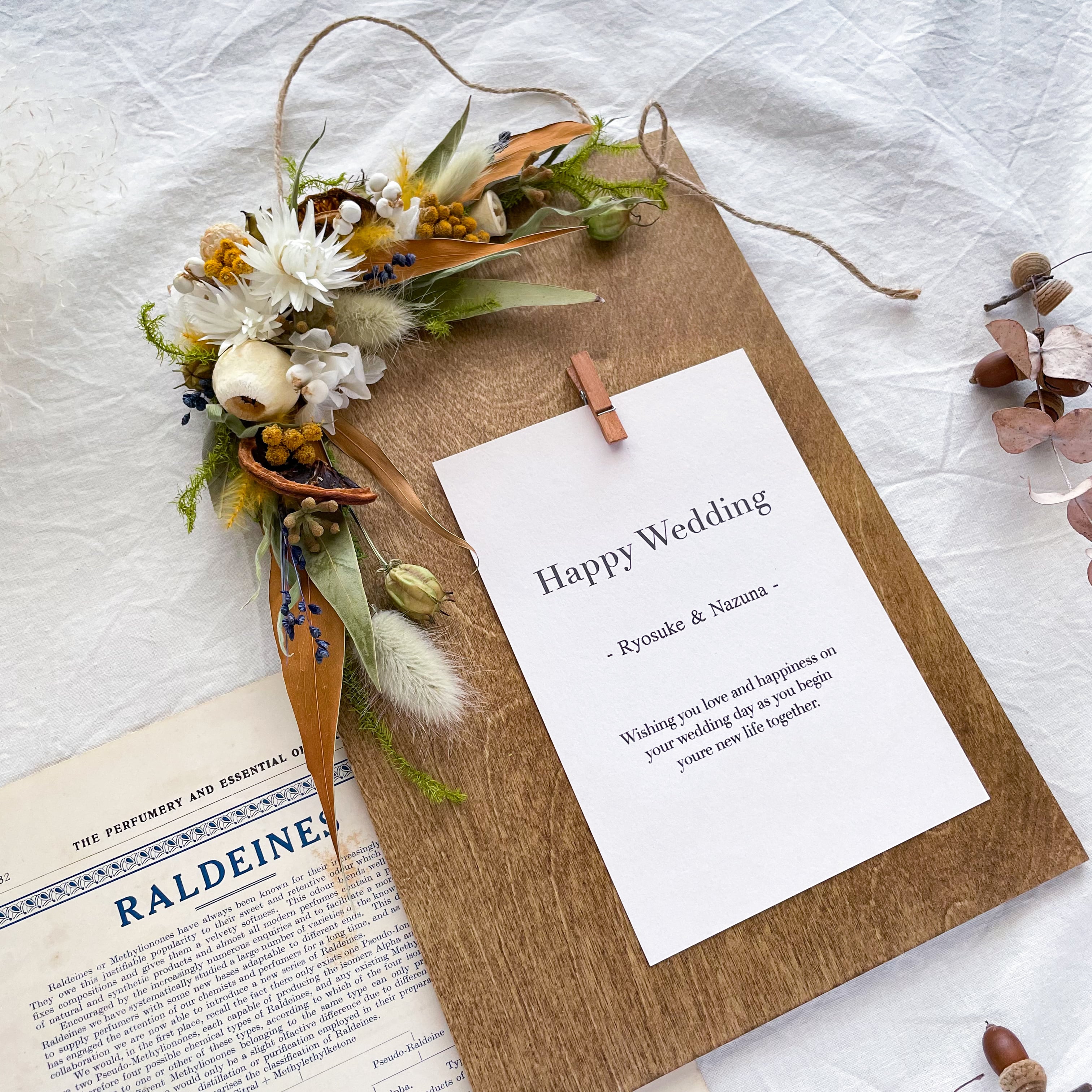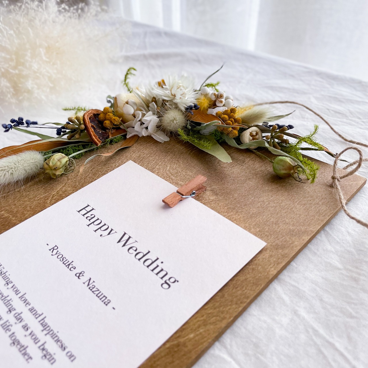 オイル仕上げの板に、ドライフラワーを添えたメッセージボードです。お好きなメッセージと一緒に贈り物や、ご自宅用としても飾っていただけます。
