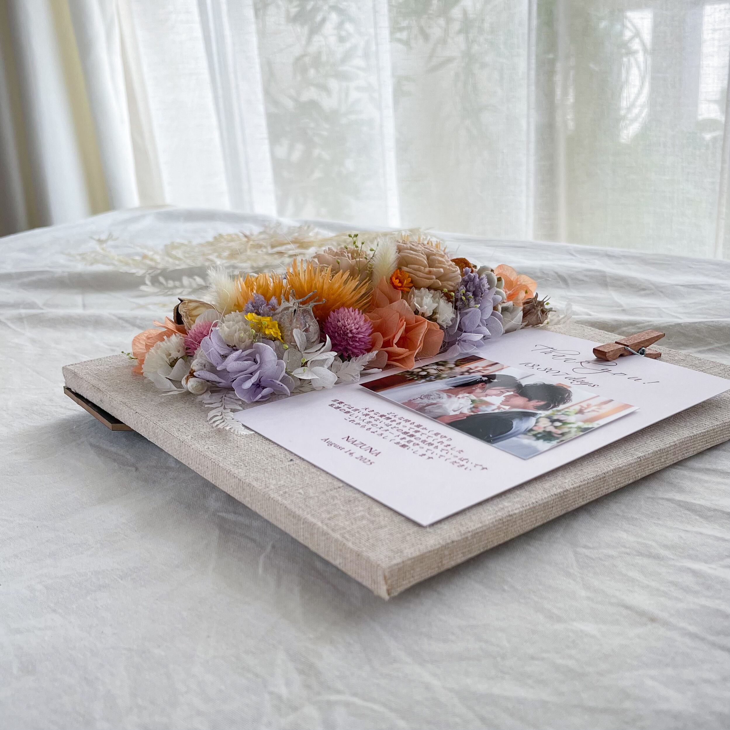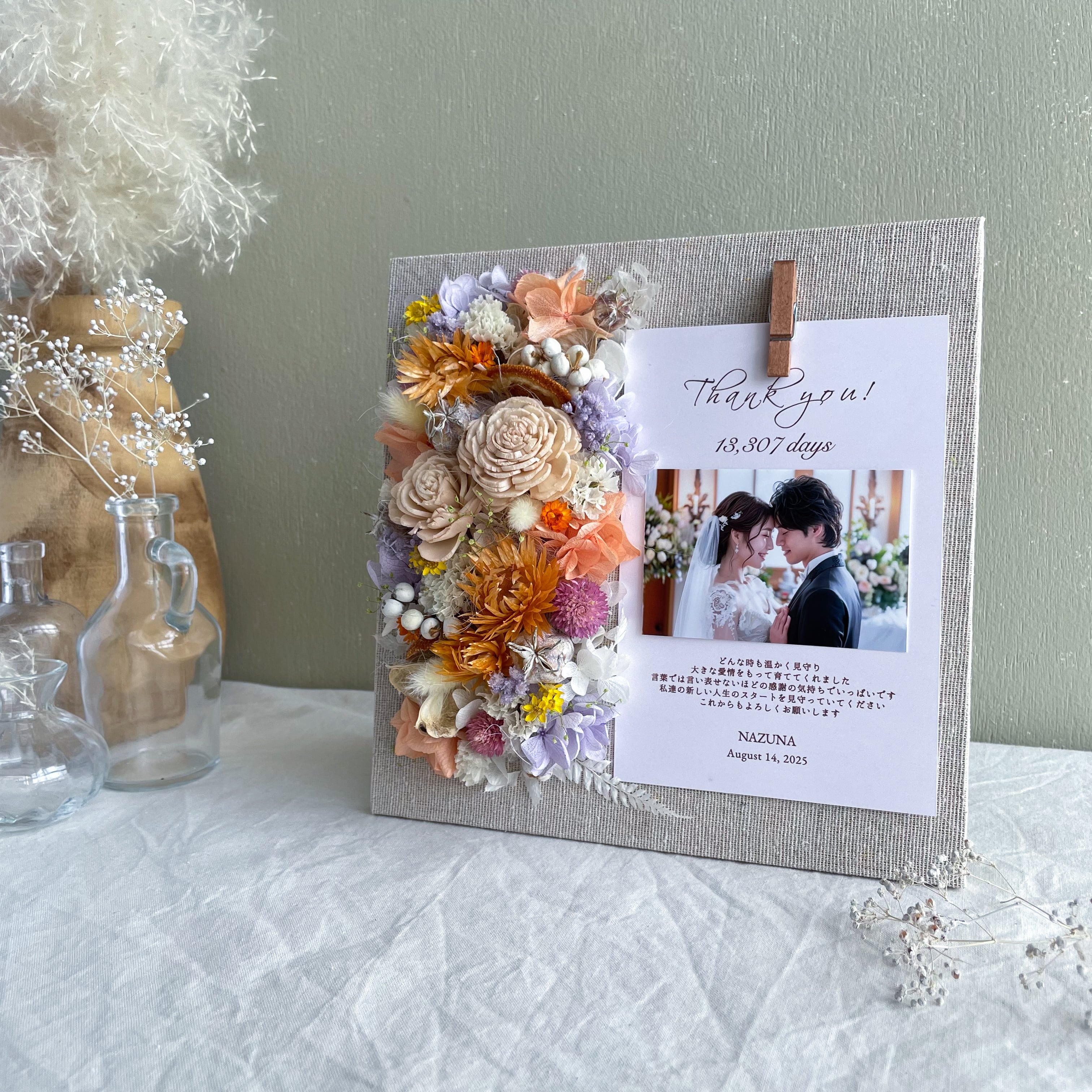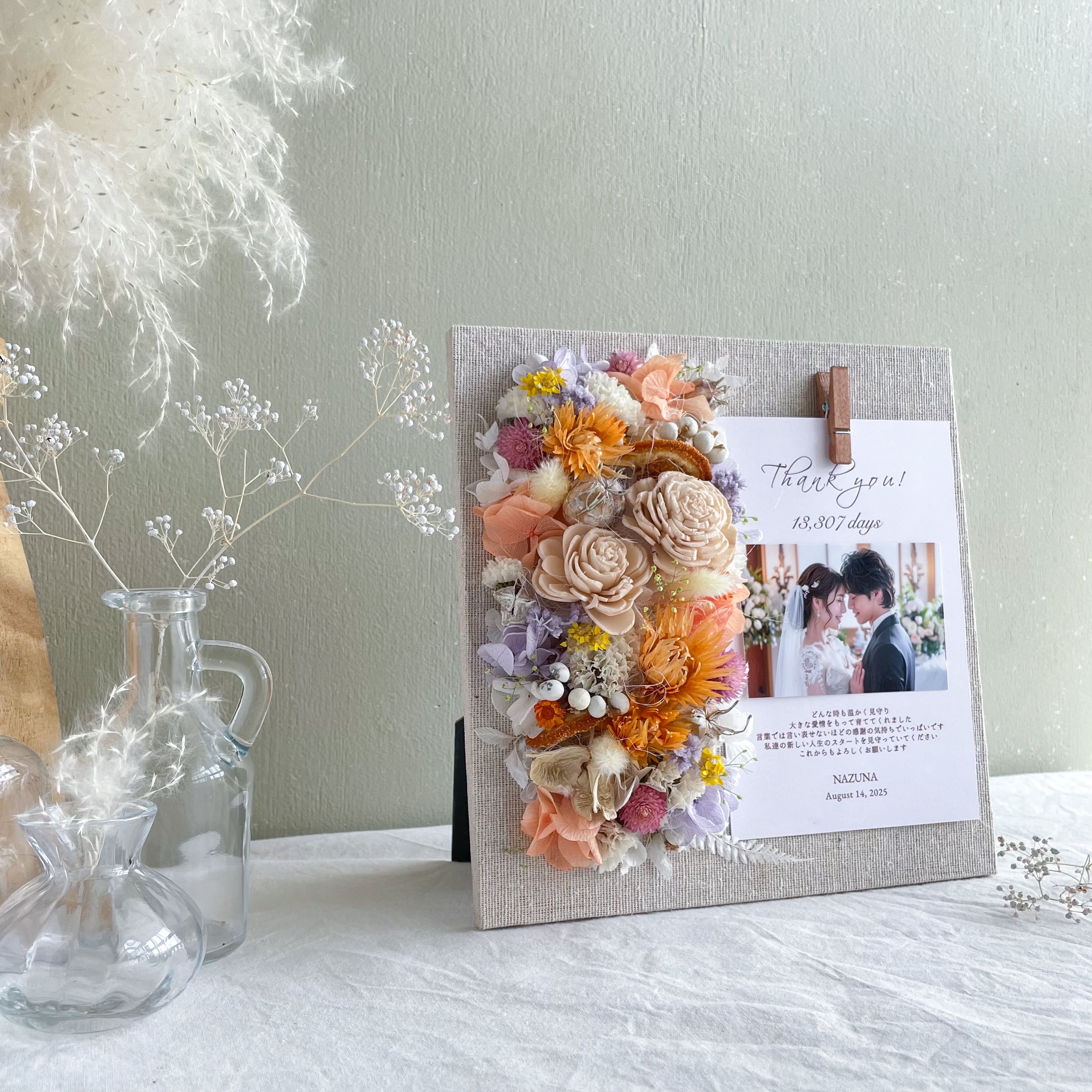 お花をアレンジしたキャンバス地フォトフレームです。お名前入りメッセージカードが付いているので、誕生日や記念日のプレゼントに最適です。さらに、カードは差し替え可能なので、季節や気分に合わせてアレンジも楽しむことができます。一つ一つ手作りで、丁寧にお届けしています。お祝いごとや、ペットの写真フレームにも最適。お部屋に飾ることで、癒しの空間を演出することができます。是非、特別な思い出を、このフォトフレームに収めてみませんか。