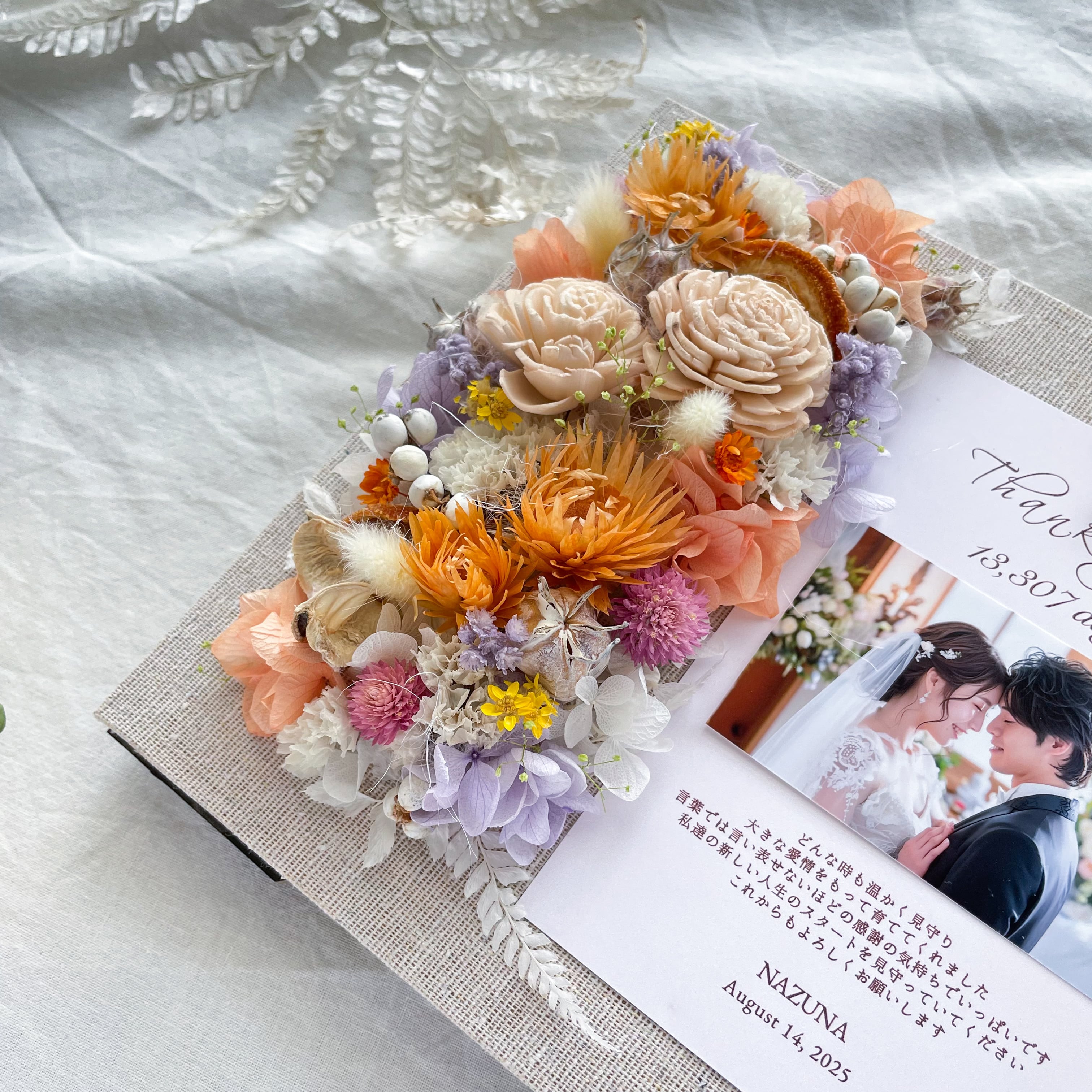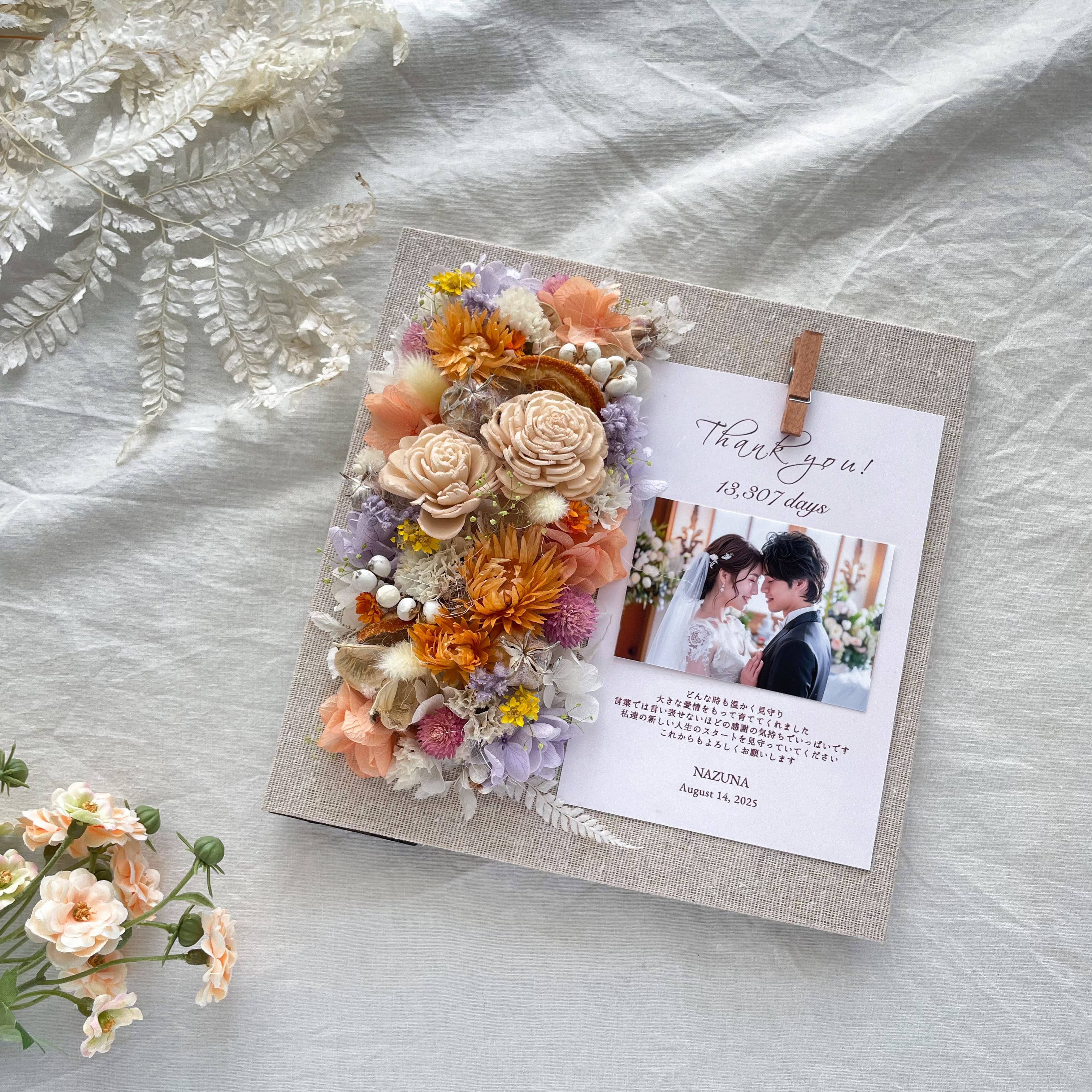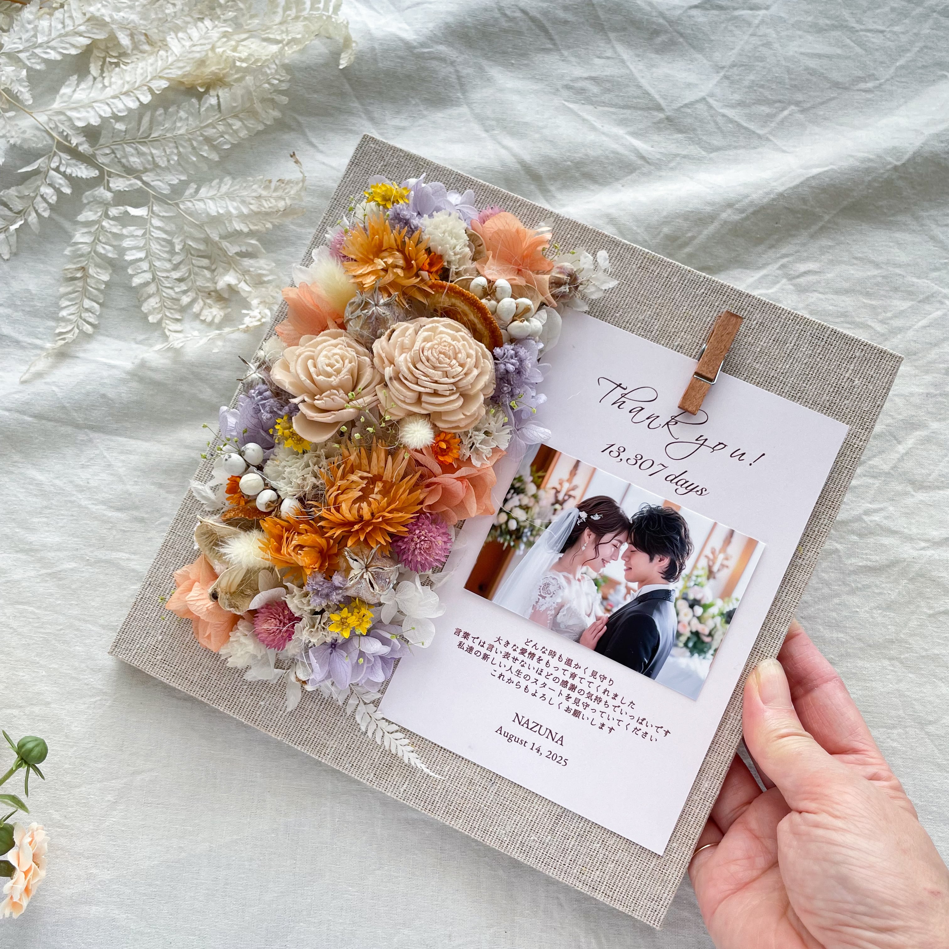 お花をアレンジしたキャンバス地フォトフレームです。お名前入りメッセージカードが付いているので、誕生日や記念日のプレゼントに最適です。さらに、カードは差し替え可能なので、季節や気分に合わせてアレンジも楽しむことができます。一つ一つ手作りで、丁寧にお届けしています。お祝いごとや、ペットの写真フレームにも最適。お部屋に飾ることで、癒しの空間を演出することができます。是非、特別な思い出を、このフォトフレームに収めてみませんか。