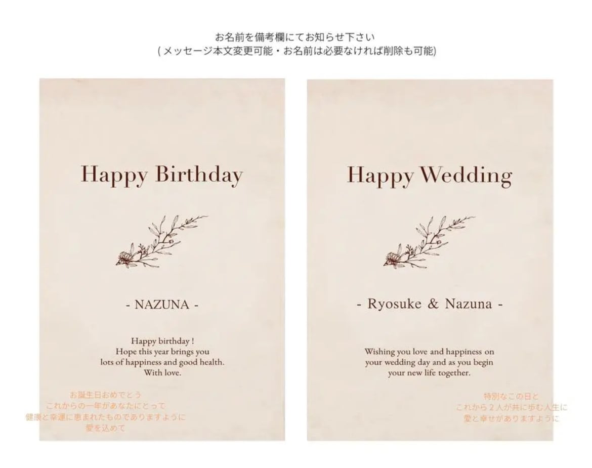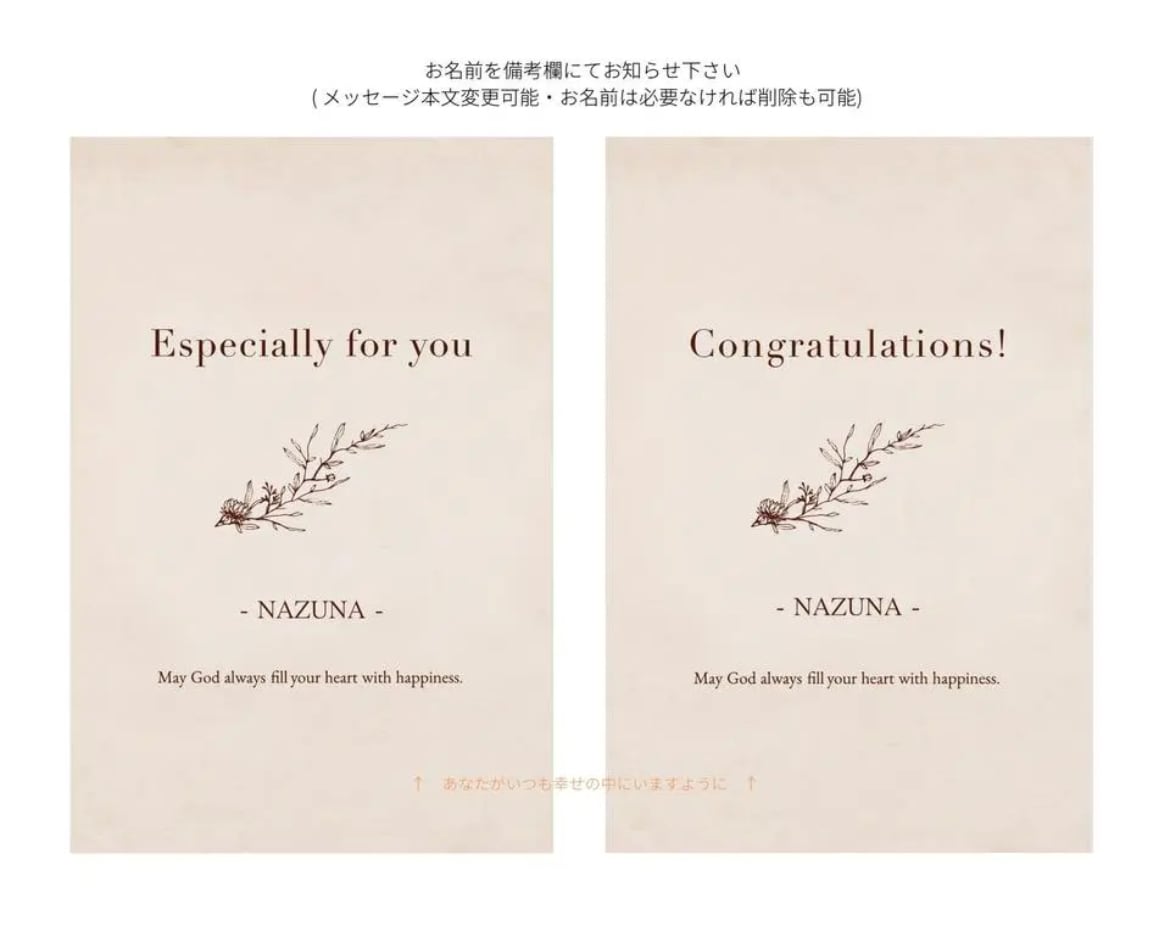 また、ご希望のオリジナルメッセージを英文or日本語でお入れできます。備考欄にてお知らせください。
