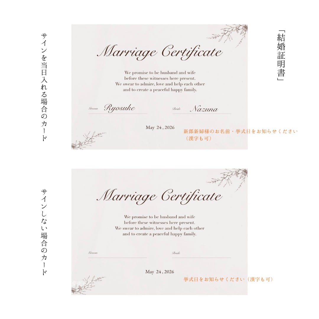 ❸当日、証明書にサインをされる場合と、されない場合、ご希望のカードをオプションにて選択してください。備考欄にて「挙式日」「新郎新婦様のお名前」をお知らせください。