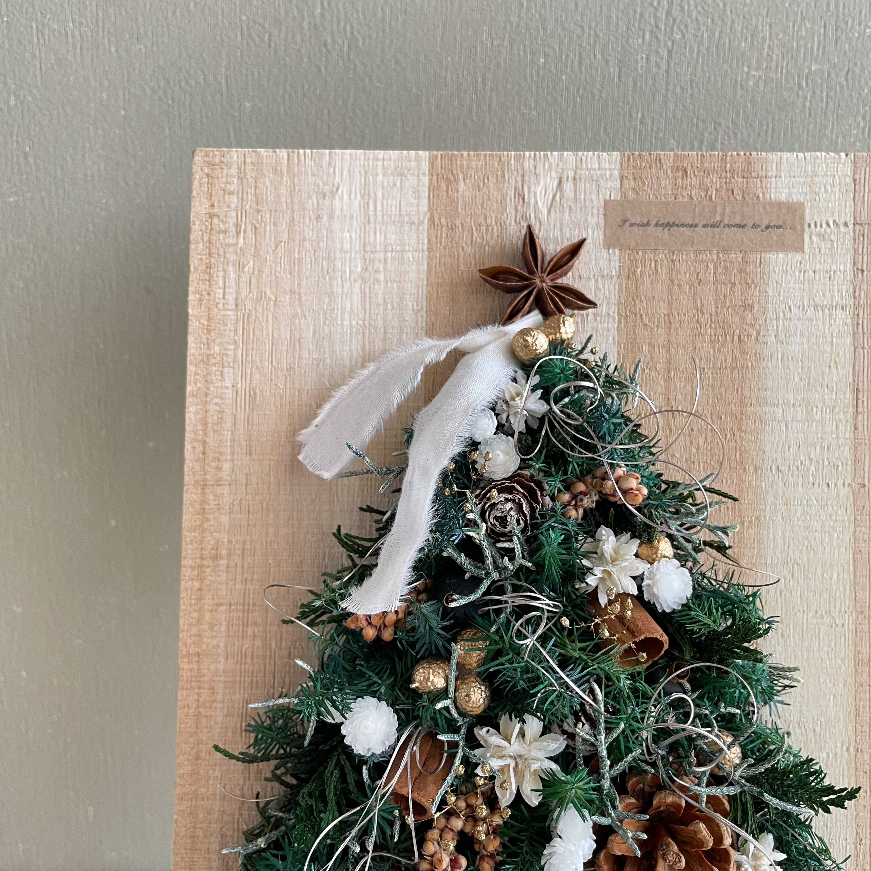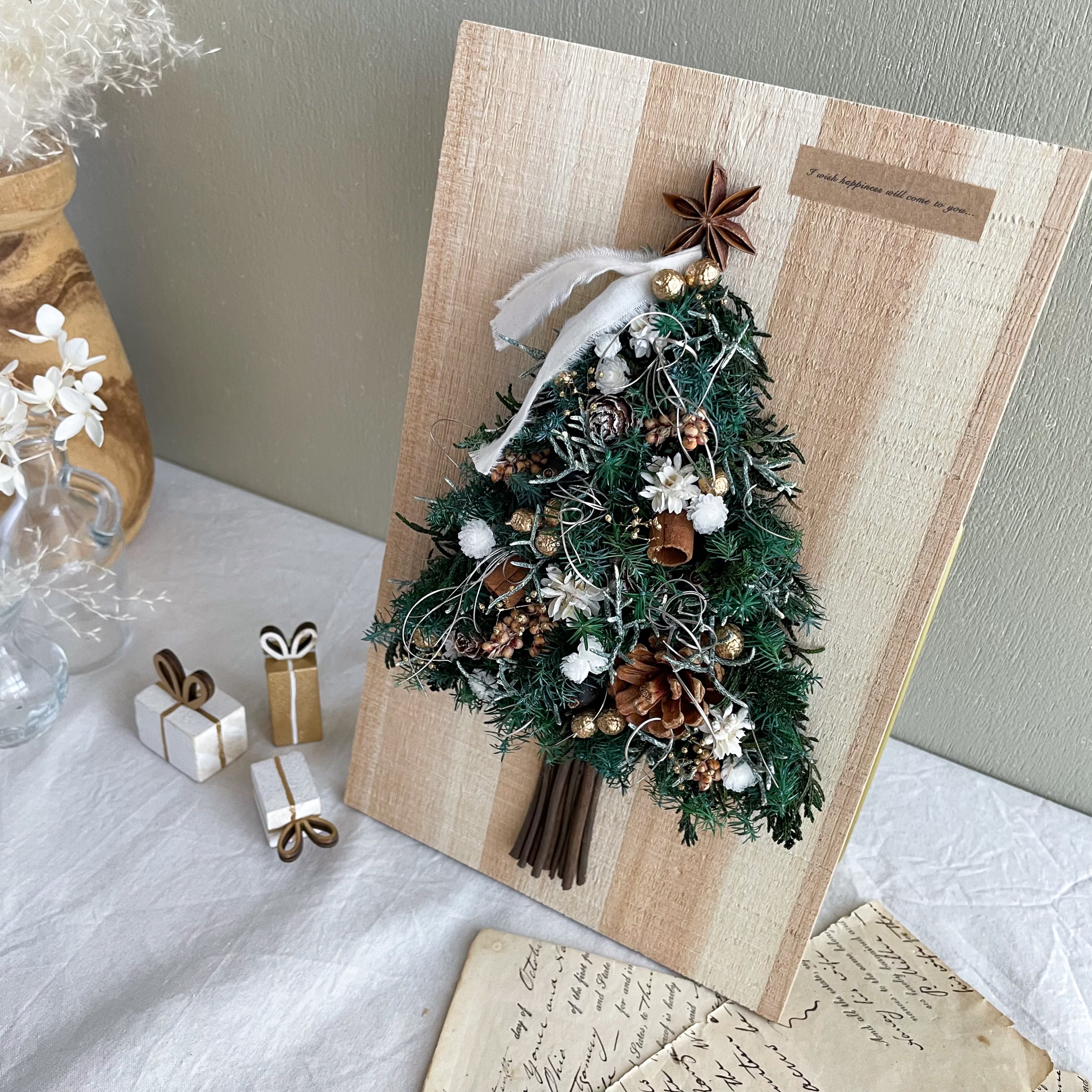 クリスマスの季節に、あなたの部屋を特別な空間に変えてみませんか?このプリザーブドフラワーとドライフラワーを用いたクリスマスツリーは、一点一点異なる木肌、木柄のボードにアレンジし、自然の温もりを感じるデザインが特徴です。スタンドタイプのボードなので、どこにでも簡単に飾ることができ、小さなスペースにも華やかさを添えます。