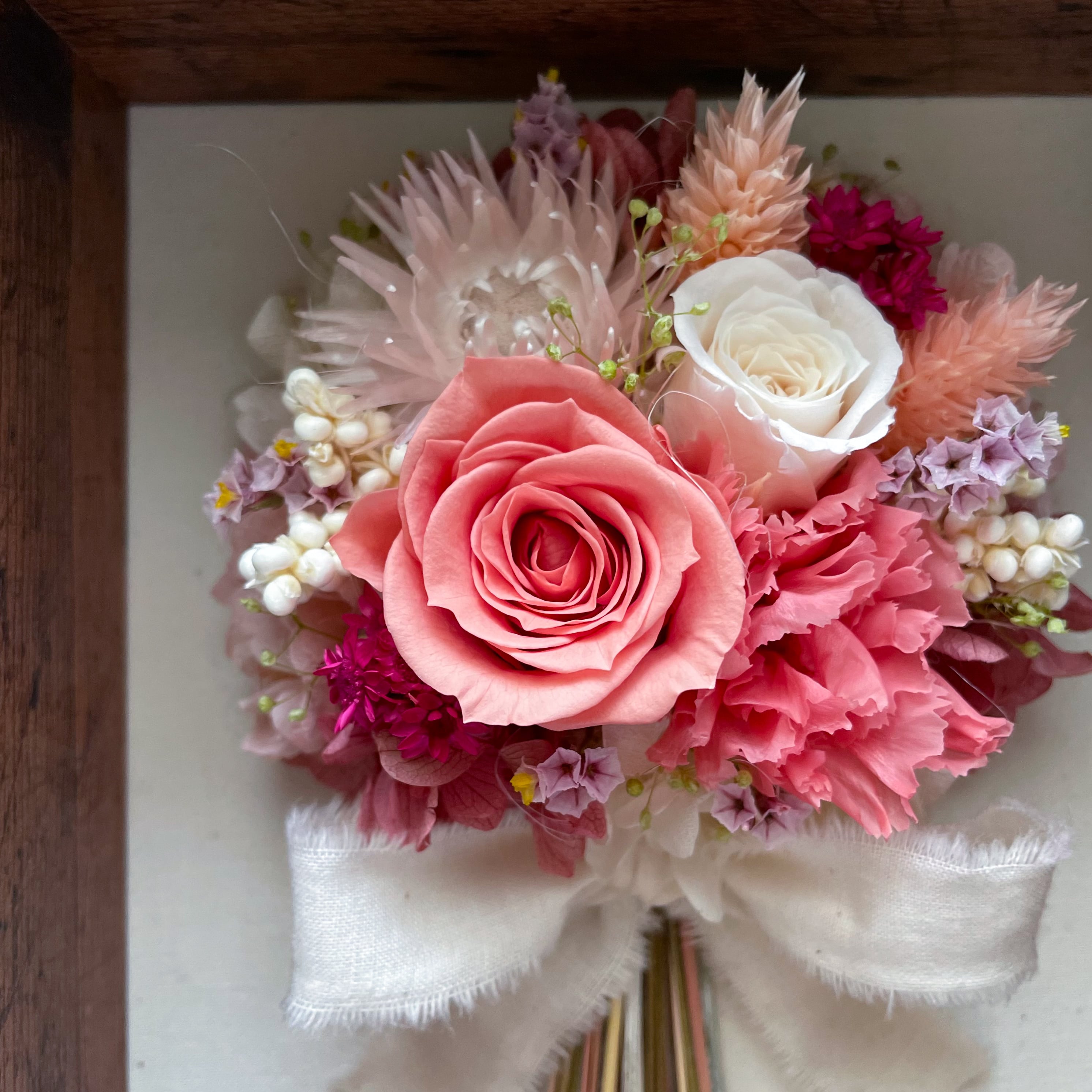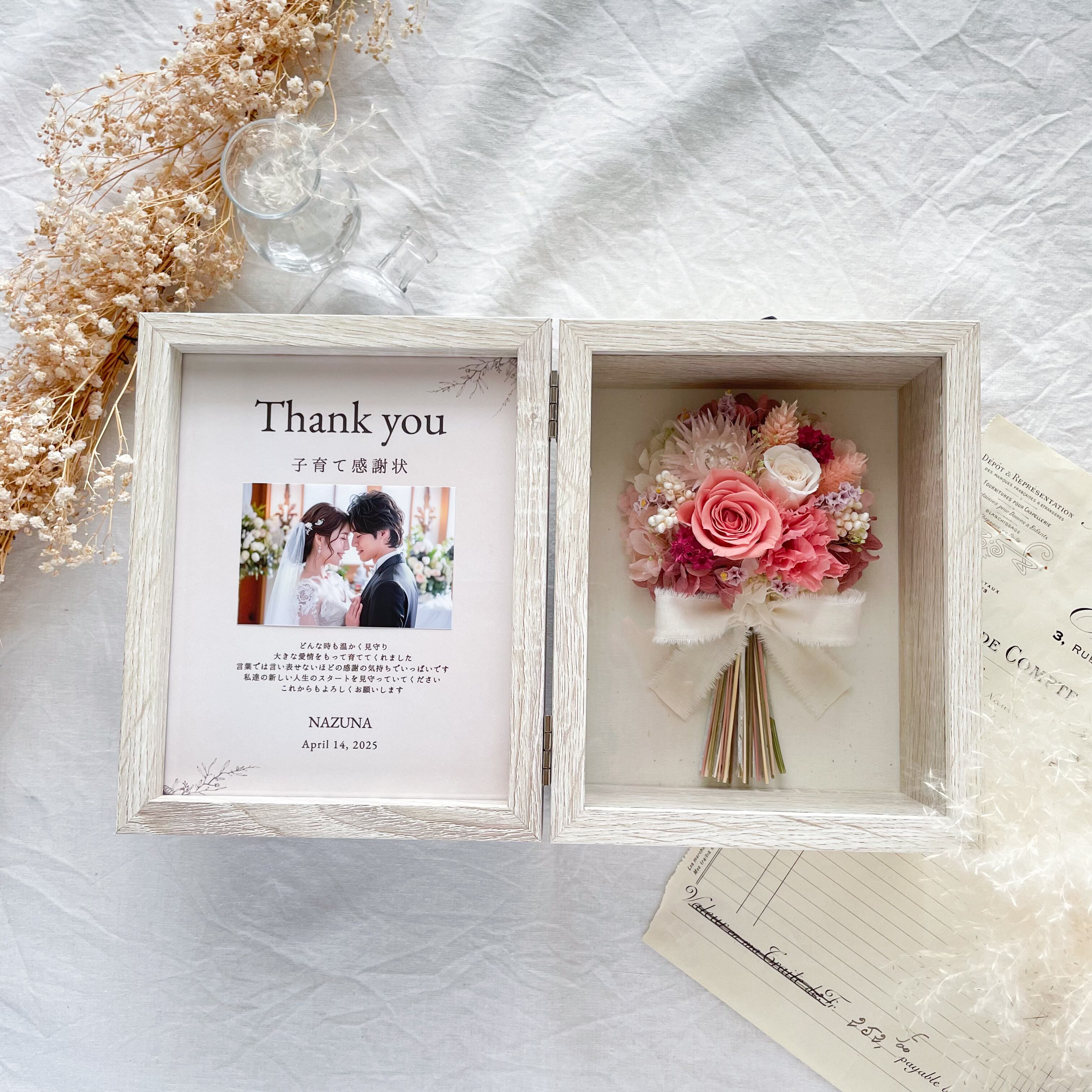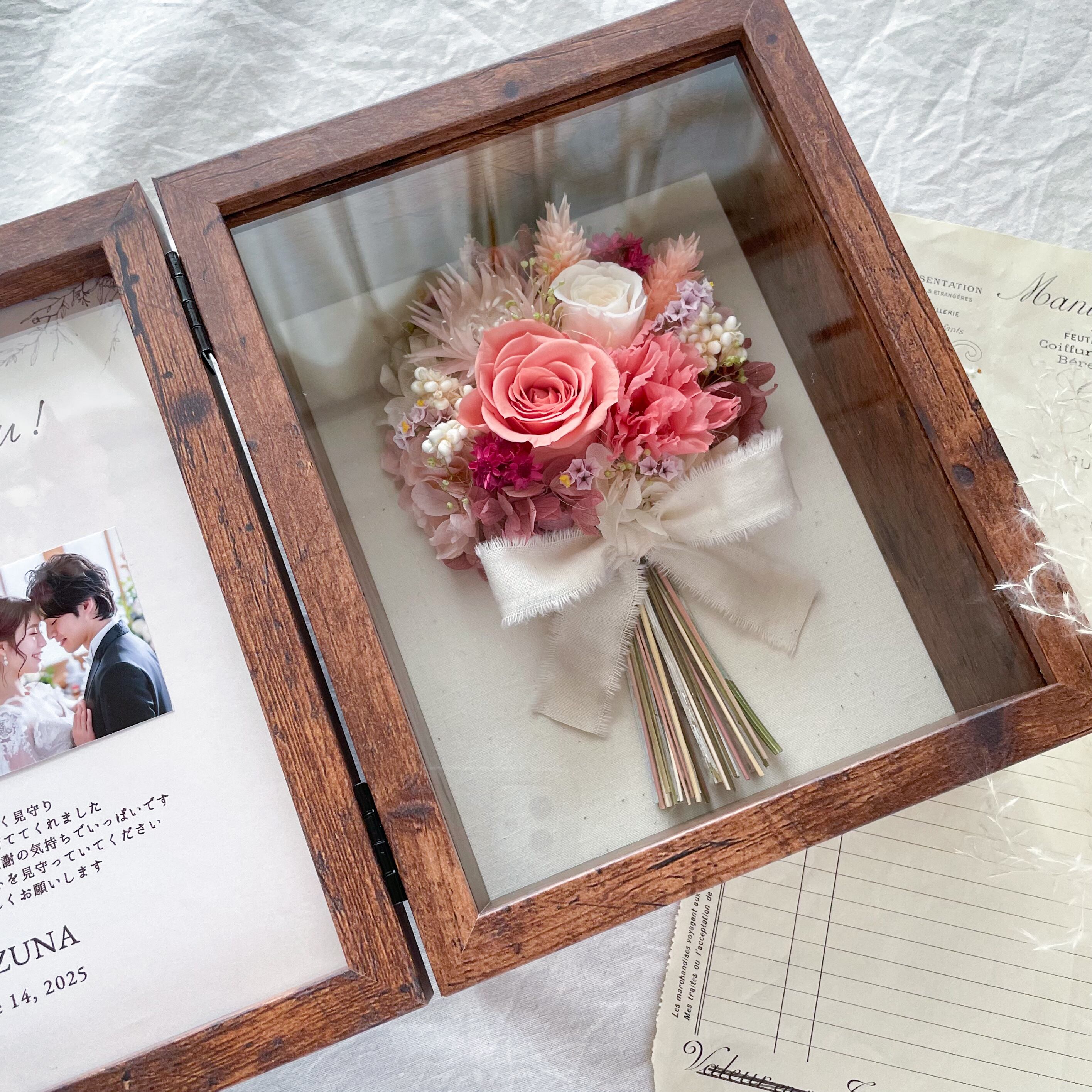 【両親贈呈品・BOXが選べる】ミニブーケのフォトボックス(コーラルピンクバラ入り)