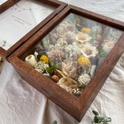 木目調のブラウンのボックスに、お花をたくさん詰め込んだフラワーフォトボックスです。カードは差し替え可能なので、季節や気分に合わせてアレンジも楽しむことができます。一つ一つ手作りで、丁寧にお届けしています。お祝いごとや、ペットの写真フレームにも最適。お部屋に飾ることで、癒しの空間を演出することができます。特別な想いを、このフォトボックスに収めてみませんか。