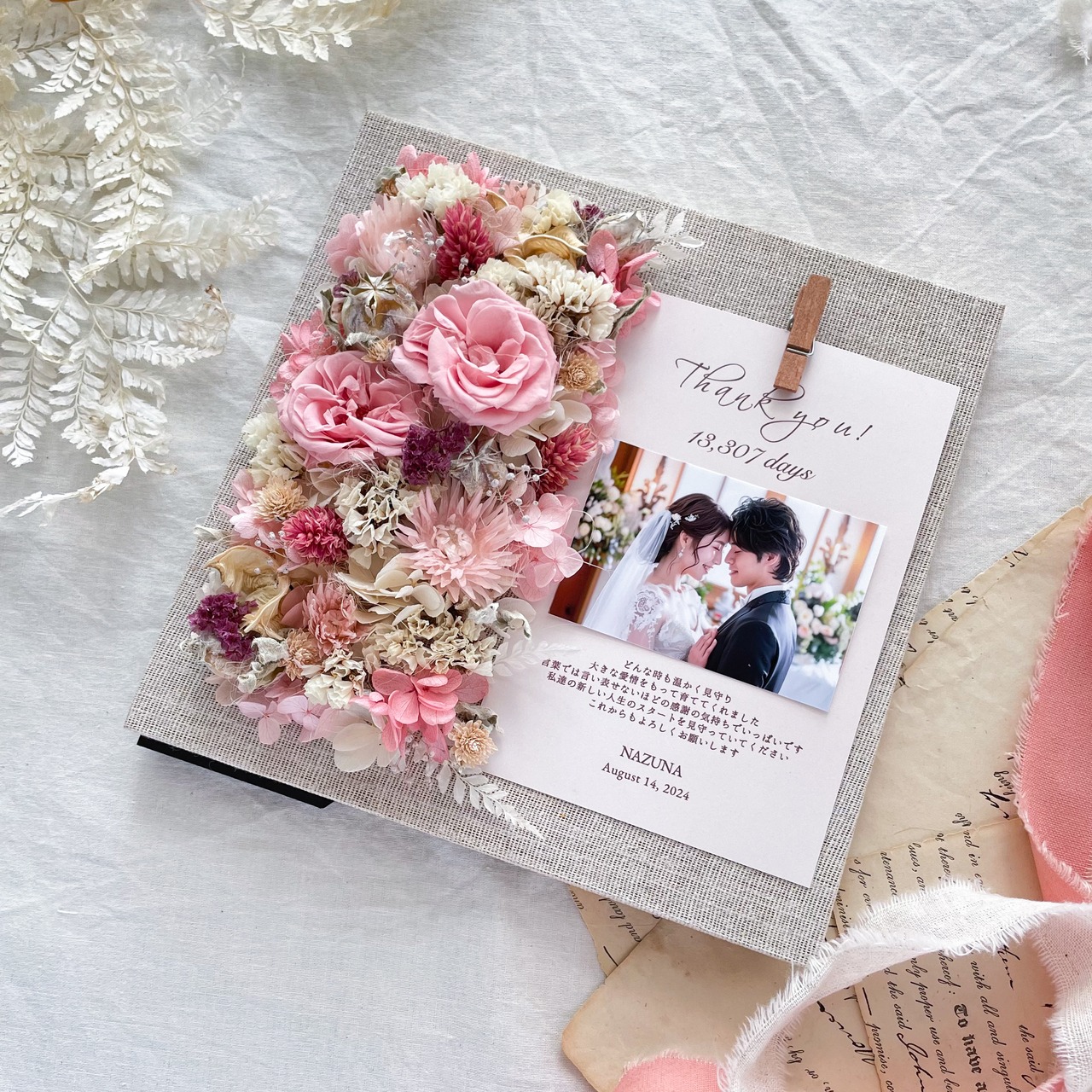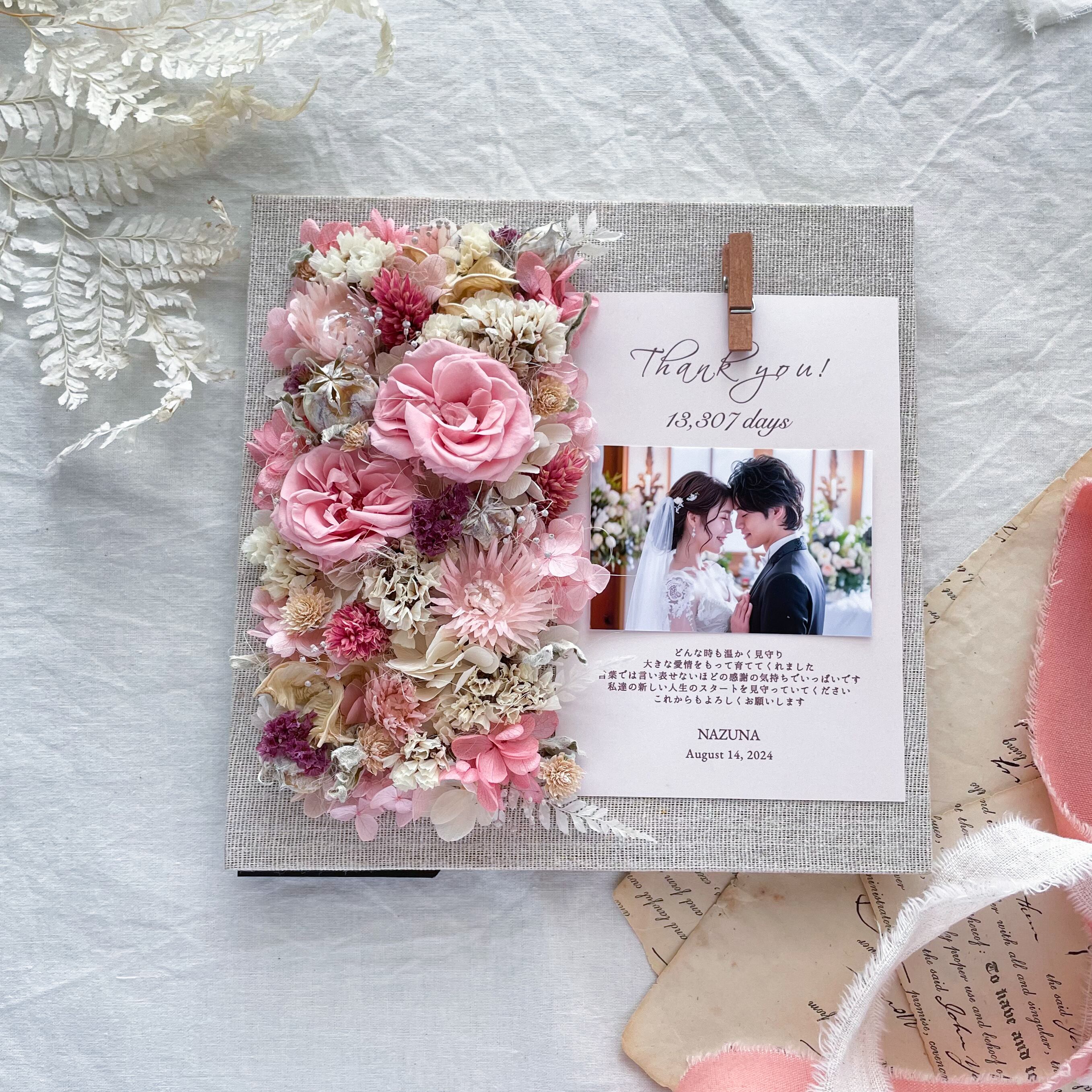 お花をアレンジしたキャンバス地フォトフレームです。お名前入りメッセージカードが付いているので、誕生日や記念日のプレゼントに最適です。さらに、カードは差し替え可能なので、季節や気分に合わせてアレンジも楽しむことができます。一つ一つ手作りで、丁寧にお届けしています。お祝いごとや、ペットの写真フレームにも最適。お部屋に飾ることで、癒しの空間を演出することができます。是非、特別な思い出を、このフォトフレームに収めてみませんか。